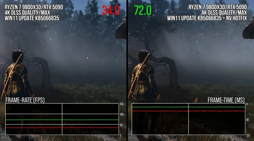 Для демонстрации взяли Assassin’s Creed Shadows. Эксперты уже наслышаны о проблемах в октябрьском патче Windows 11 (KB5066835), но обратили на них внимание лишь благодаря Nvidia. Производитель видеокарт обновил драйвер, а в примечаниях обвинил апдейт Windows 11 в снижении производительности в «некоторых играх».