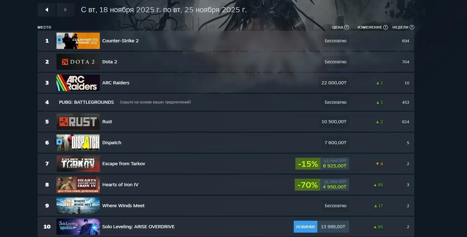 В российском чарте первые два места продолжают удерживать Counter-Strike 2 и Dota 2, а вот тройку лидеров закрыла ARC Raiders. Комедийная Dispatch не поменяла своей позиции и осталась на шестом месте.