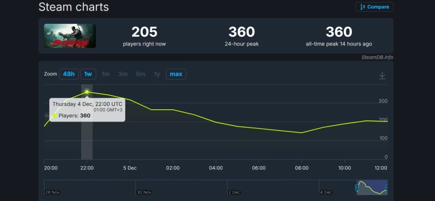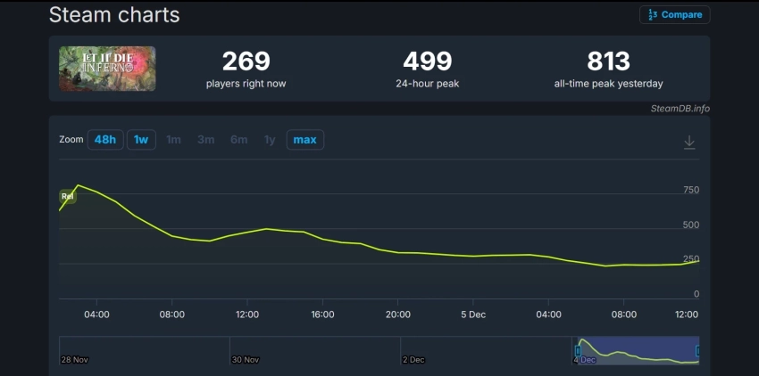 Пиковый онлайн Let It Die: Inferno в Steam составил 813 человек. У оригинальной условно-бесплатной Let It Die онлайн превысил 1900 игроков более семи лет назад.