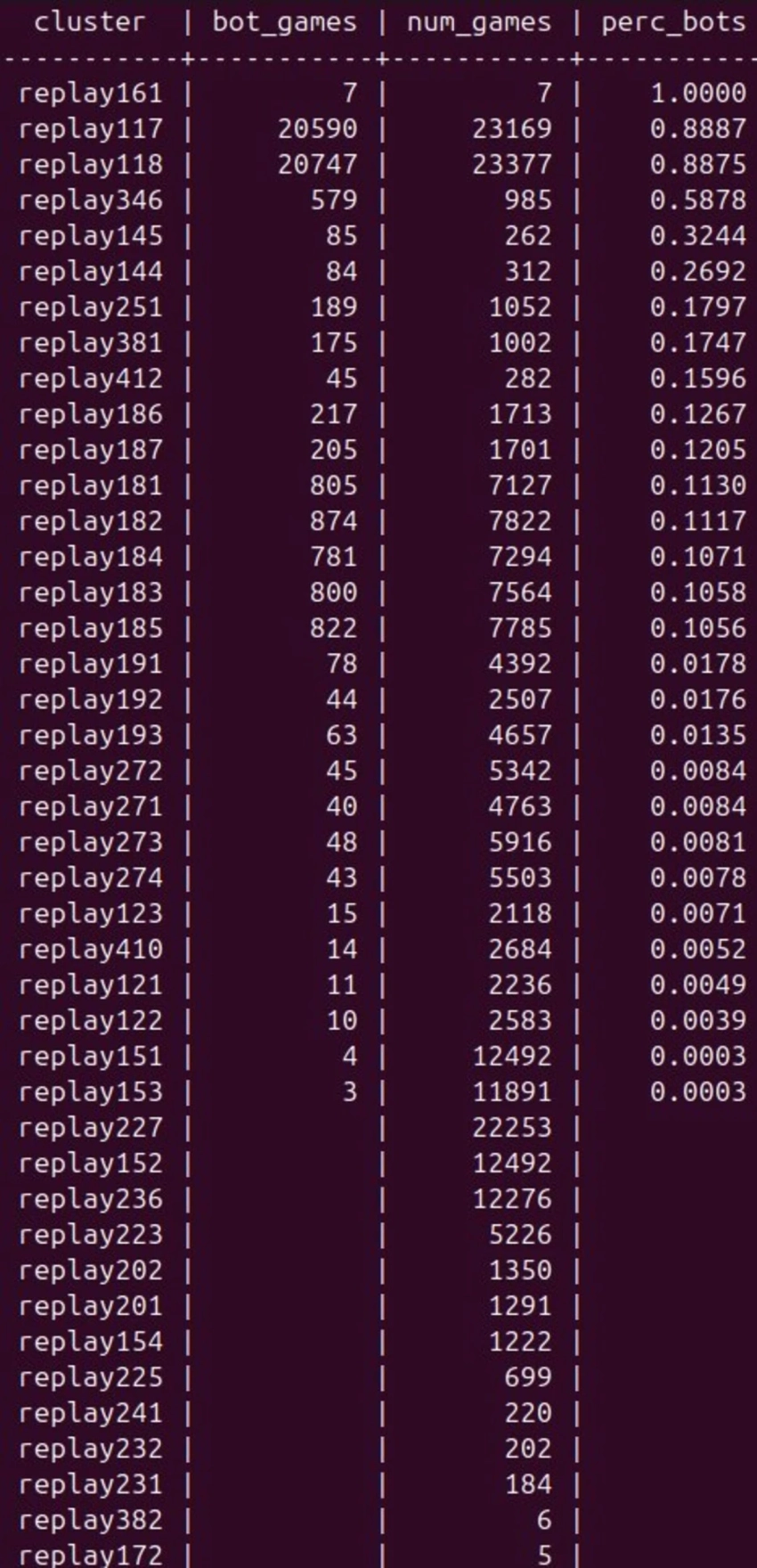 • В кластере replay161 зафиксировано 100% матчей с ботами, хотя выборка там совсем небольшая (7 игр).